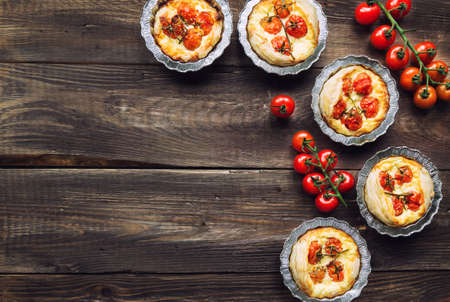 Fresh homemade tarts with cherry tomatoes and goat cheese on rustic wooden background. Top view.