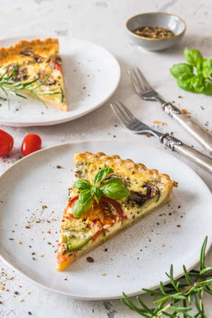 Piece of homemade vegetable tart with mushrooms, tomatoes and zucchini on white background, vertical