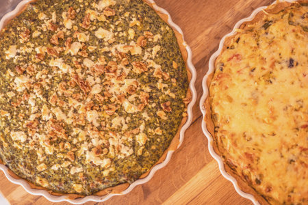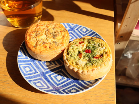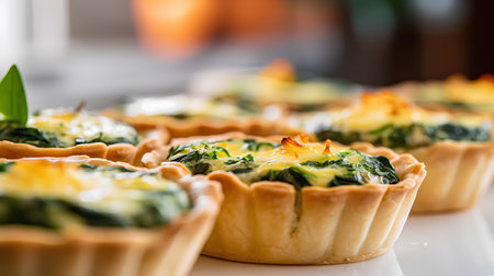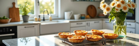 Freshly baked quiches cooling on a kitchen counter in bright sunny room. That the image is generated using AI.