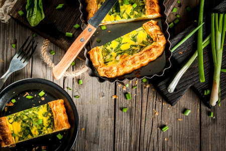 French home cooking. Casserole. Pie. quiche lorraine from puff pastry, with young green onions and spinach. On old wooden rustic table. Cut. In form for baking. Plate, fork, knife. Copy space top view