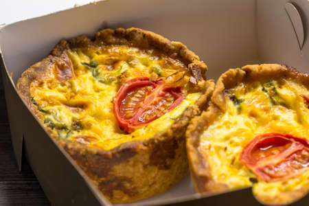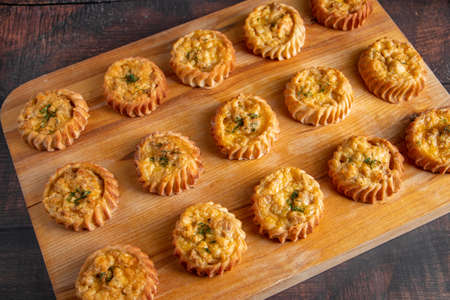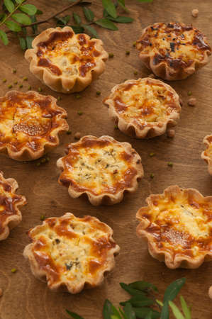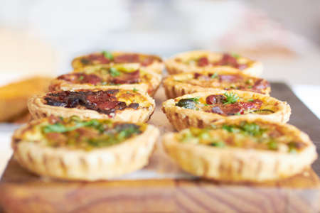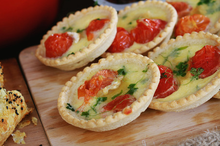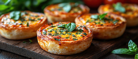 Savory mini quiches or tarts on a rustic board. Flaky dough pies. Fresh basil and tomatoes on handmade quiche