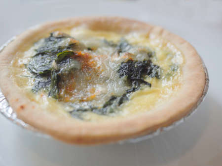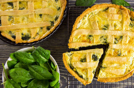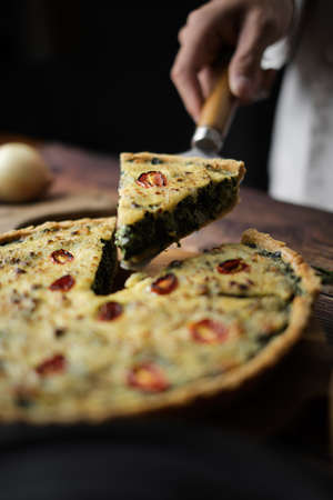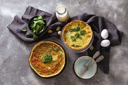 Homemade cheesy spinach quiche for brunch. set on wooden cafe table background.