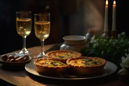 Festive Quiche (pie) with ham, tomatoes, spinach and soft cheese on a wooden background with a glass of wine. Generative AI