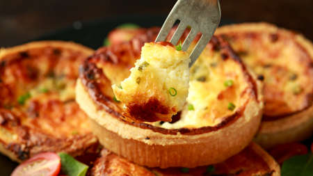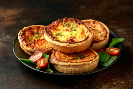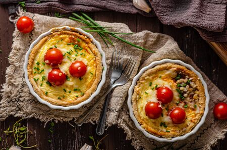 Baked homemade quiche pie in mini metal forms served with fresh greens, kitchen towel and fork in dark wood tray on old plank wooden background. Flat lay with space
