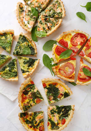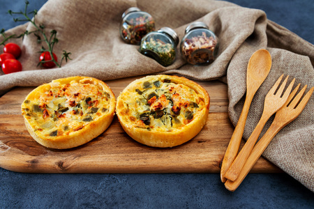 Set of savory mini tarts on a baking paper. Vegetable quiches with tomatoes, mushrooms, herbs, broccoly. Blue stone background. Close up and copy space.