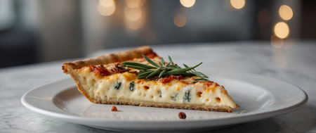 AI Generated. Elegantly presented cheese pizza with a rosemary sprig on a white plate with a blurred background