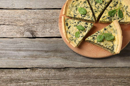 Cut delicious spinach pie on wooden table, top view. Space for text