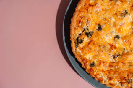 Quiche, salmon pie, broccoli, cheese. Quiche tart with fish and vegetables, cheese, salt and spices, healthy food