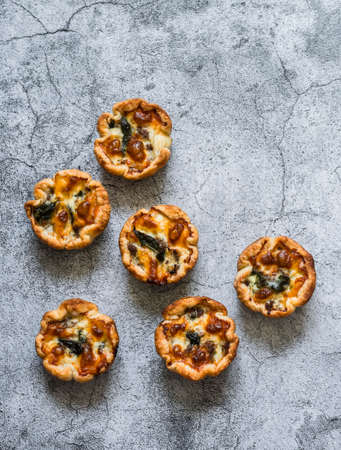 Minced meat, spinach, mozzarella cheese mini pies for appetizers, tapas on a gray background, top view