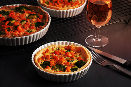 Home made french tart quiche with crayfish and broccoli filled with cream and eggs. Easy recipe