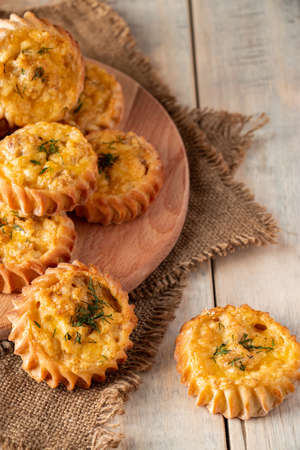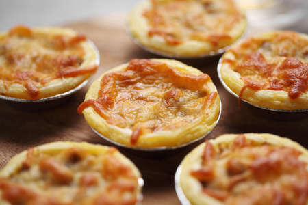 Mini pie from meat and mushrooms in wooden tray on loft background