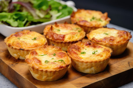 Cheddar cheese and spring onion omelette tarts served on wooden board with side salad. Healthy breakfast food