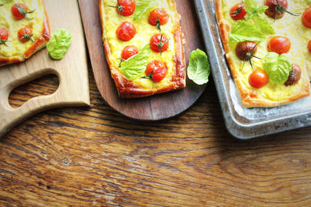 Fresh tomato tart, puff pastry topped with ricotta, cheese and cherry tomatoes .