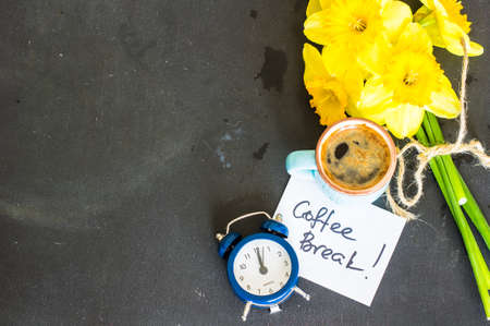 Business and positive concept. On the table there is a clock, a pen, a notebook and a card on which the text is written - COFFEE BREAK