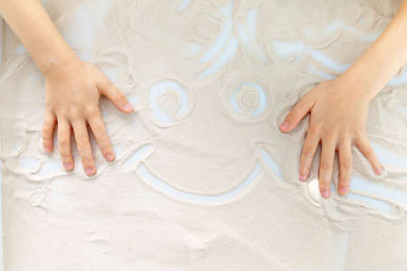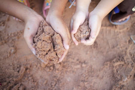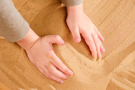 pours sand from his hands. Manual sifting of sand. Horizontal Photo.