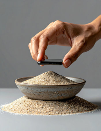 A careful hand attempts a popular DIY life hack, placing a water-damaged electronic device into a bowl of uncooked rice.