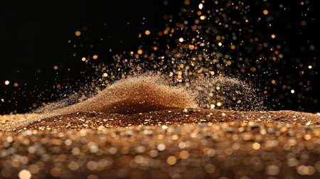 A stunning close-up image of a fine sand pile accentuated by sparkling dust particles in the air, showcasing rich textures and natural beauty.