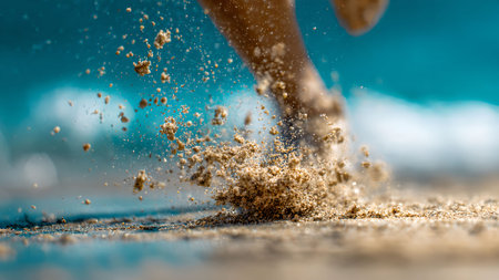 Close-up of a foot kicking sand on the beach. Summer vacation and travel concept.