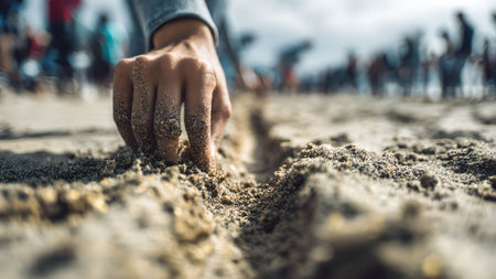 Close-up of a hand drawing a line in the sand on a beach, creating a sense of connection with nature.