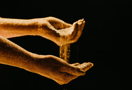 A captivating image of a hand delicately sprinkling fine golden sand, creating a mesmerizing display of sparkling particles amidst a soft glow.