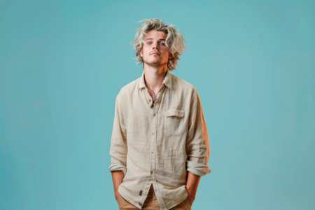 A young man with long hair gazing thoughtfully out of a window, soft natural light illuminating his face, minimalistic background