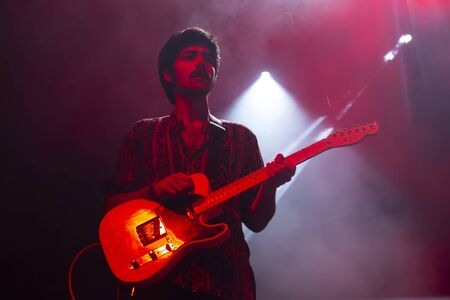 European man skillfully plays an electric guitar, radiating confidence and musical talent
