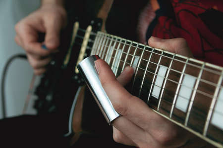 Person sliding a bottle neck along the strings of an electric guitar. Selective focus. Copy space.