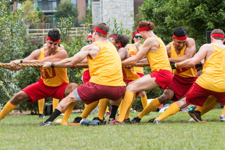 Atlanta, GA, USA - July 14, 2018: A team of young adult men and women compete in a tug of war contest during Atlanta Field Day at Old Fourth Ward Park, on July 14, 2018 in Atlanta, GA.