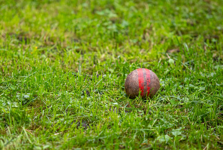 Cricket ball on green grass, closeup. Sport concept