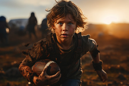 Detailed close-up of a weathered football showcasing its textured surface, muddy accents, and vibrant colors, emphasizing the joy of outdoor sports and play.