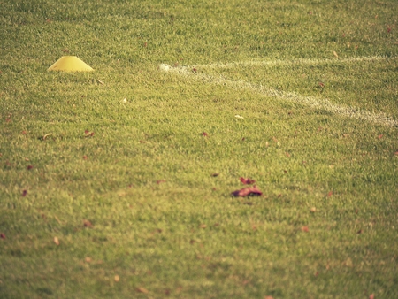 Fall leaves on playground. Autumnal weather symbol on football field. Yellow leaves in an autumn
