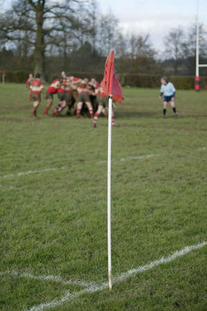 Rugby corner flag with blurred players behind