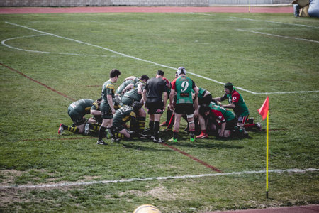 Zamora, Spain - August 30, 2018: Rugby tournament at the Zamora stadium, Spain. Rugby match between Rugby club Zamora and Rugby club Torrealday all. Rugby players fight for the ball on rugby stadium.