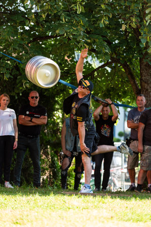 Draft keg throwing contest at moto camp in Prnjavor during moto meet
