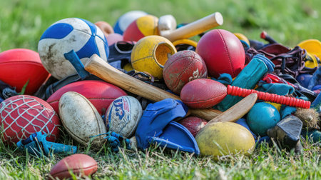This vibrant heap of diverse sports balls and gear showcases the joy of play and active living, perfect for concepts promoting fitness, teamwork, and outdoor recreation.