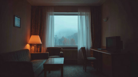 A warm hotel room featuring a sofa, lamp, and wooden furniture, with large windows revealing fog-covered mountains surrounded by trees in soft light.