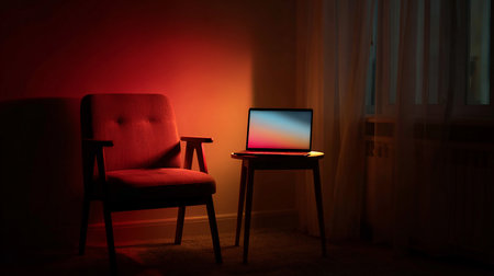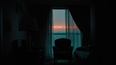 An interior shot features an armchair centered before a window, with sheer curtains partly obscuring the view. The scene is bathed in dim light, with silhouettes defining the furniture. The composition suggests a tranquil setting with potential uses in editorial, or commercial applications. The sunset can be seen from the window, and a bed in the right.