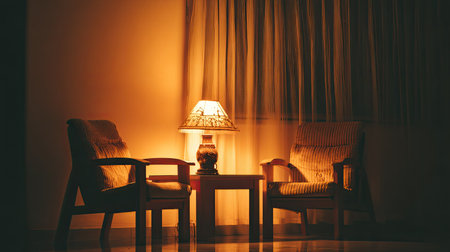 Warmly lit interior corner showcasing vintage aesthetic and design