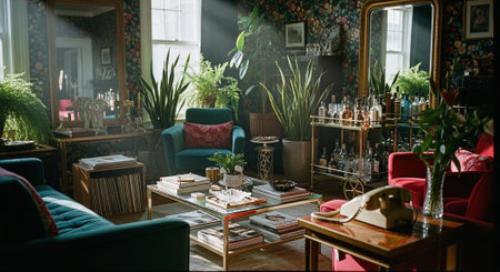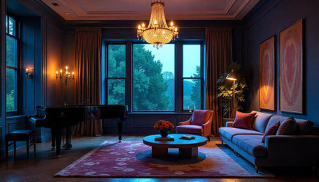 A luxurious interior featuring bold art pieces, elegant furniture, and dramatic lighting, creating a refined and cozy atmosphere.
