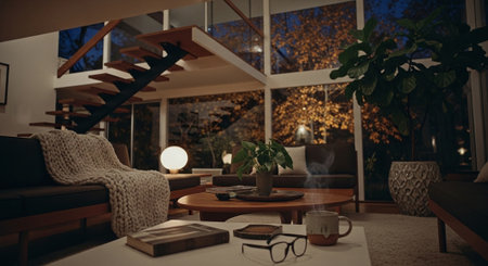 A cozy modern living room at night with large windows showing autumn trees, featuring a warm palette, a comfy sofa with a blanket, a coffee table with a steaming mug, and a stylish staircase
