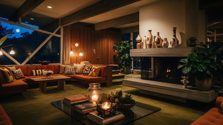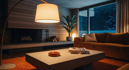 A cozy living room with a modern design, featuring a large sofa, a coffee table with magazines, a floor lamp, and a plant. The room has warm lighting and a fireplace, creating a welcoming atmosphere.