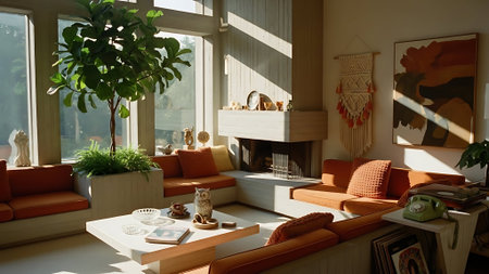A cozy modern living room with a fireplace, featuring orange and yellow sofas, wooden accents, and decorative plants