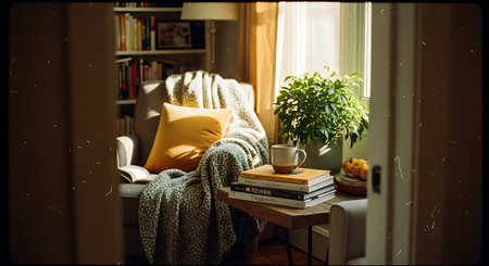A cozy living room with warm lighting, featuring a comfortable armchair, a coffee table with books, a decorative vase with dried flowers, and a steaming cup of coffee