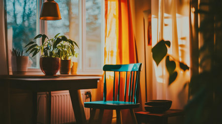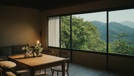 A serene dining space bathed in warm sunlight, featuring a wooden table and chairs. Perfect for capturing a cozy and tranquil atmosphere in any home.
