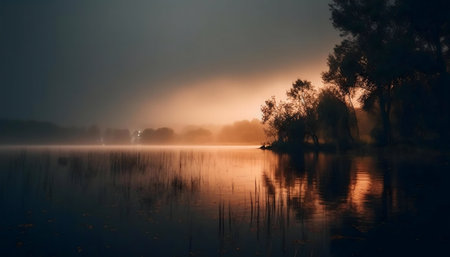Serene lake at sunrise with misty fog, trees reflecting in water.