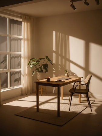 A cozy interior office space bathed in warm sunlight streaming through a large window, with a wooden desk, chair, plant, and rug.