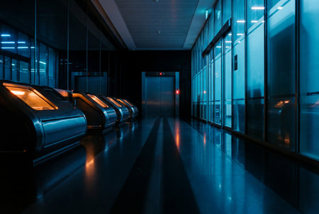 A quiet corridor with smooth glass panels and steel frames, an access gate stands at the end, the floor shadow bending oddly, casting a cool, calm atmosphere.