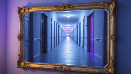 Corridor reflection with ornate mirror in an atmospheric setting showcasing cool blue lighting