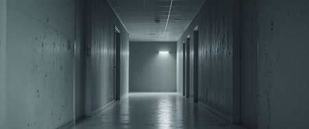 A long, dimly lit hallway with doors on either side, leading to a bright exit at the end, creating a sense of depth and mystery