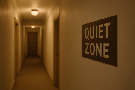 Sign indicating a quiet zone in a long corridor with doors and lights, promoting peace and tranquility